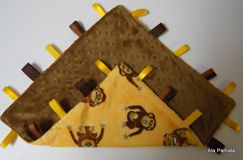 I have been making minkie tag blankies for our etsy shop AlaPamala. When I took them over to show my daughter (who is also making things for our shop), three year old Kaya told her